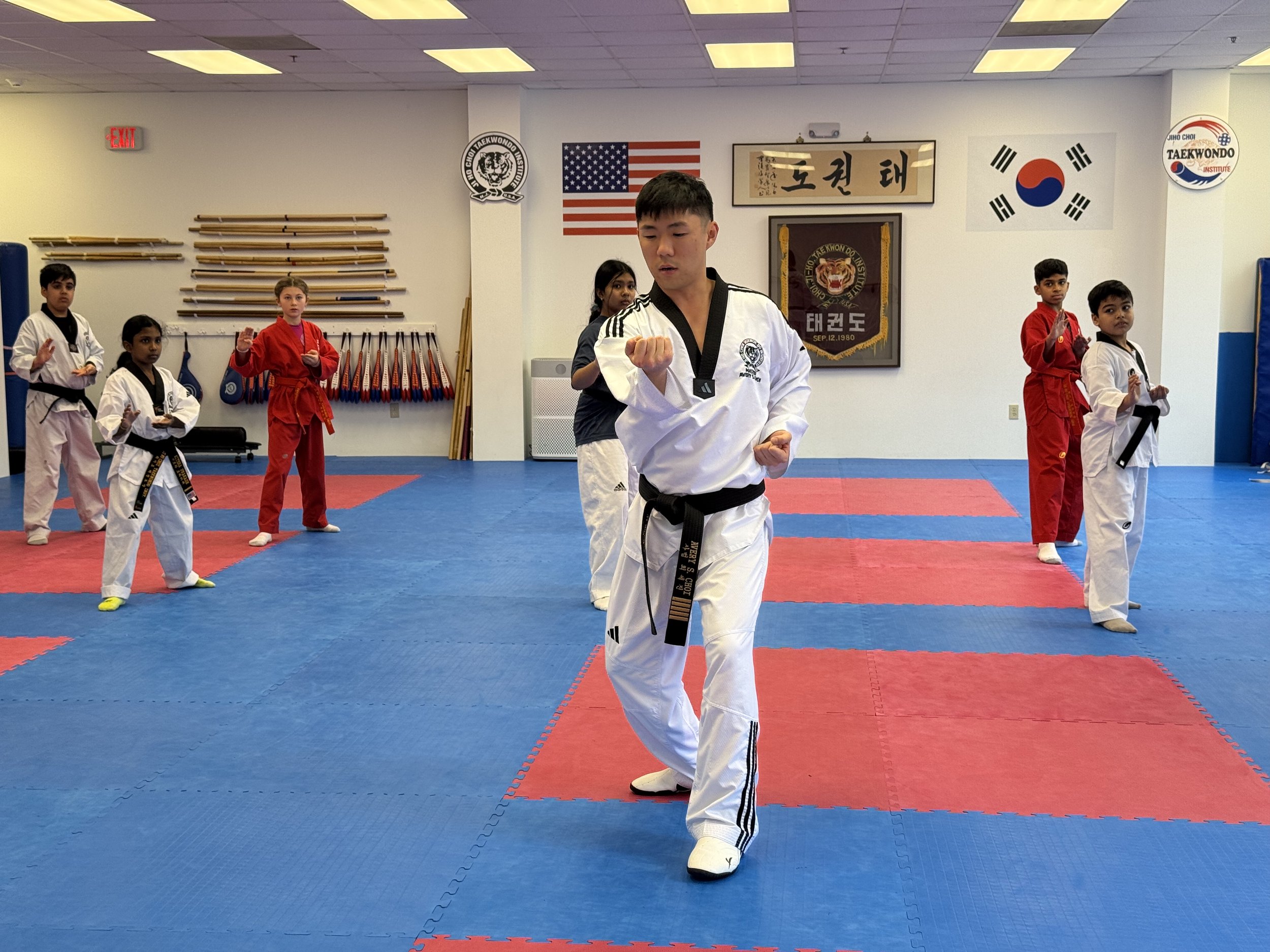 Our curriculum follows standards established by Kukkiwon, the World Headquarters for Taekwondo, and reflects the full scope of traditional training. Instruction includes philosophy, meditation, forms (poomsae), sparring, breaking, flexibility, leadership development, and overall fitness.